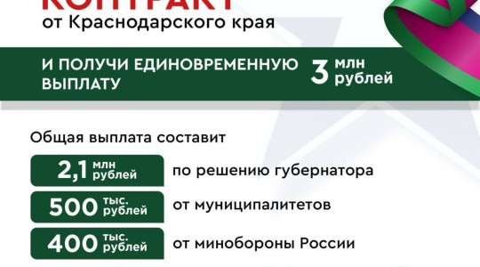 В Краснодарском крае сохранили повышенную выплату для заключивших контракт с Минобороны РФ Ранее размер краевой выплаты увеличили по решению главы региона. В результате участники специальной военной операции, подписавшие контракт с Минобороны России от Краснодарского края, получат 3 млн рублей. Выплата включает: – 2,1 млн рублей – по решению губернатора Вениамина Кондратьева; – 500 тыс. рублей […]
