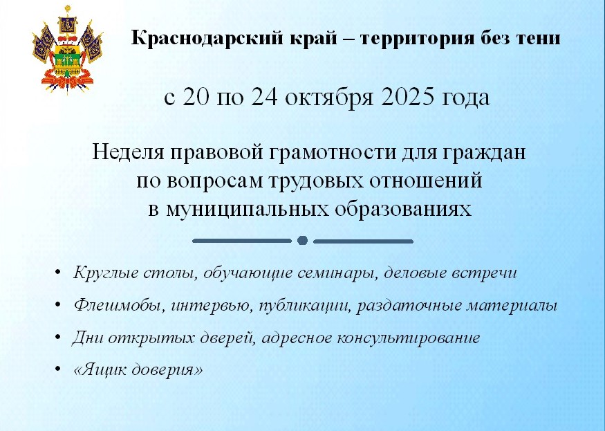 С 20 по 24 октября 2025 года в Краснодарском крае пройдет неделя правовой грамотности по трудовым отношениям «Краснодарский край – территория без тени»!