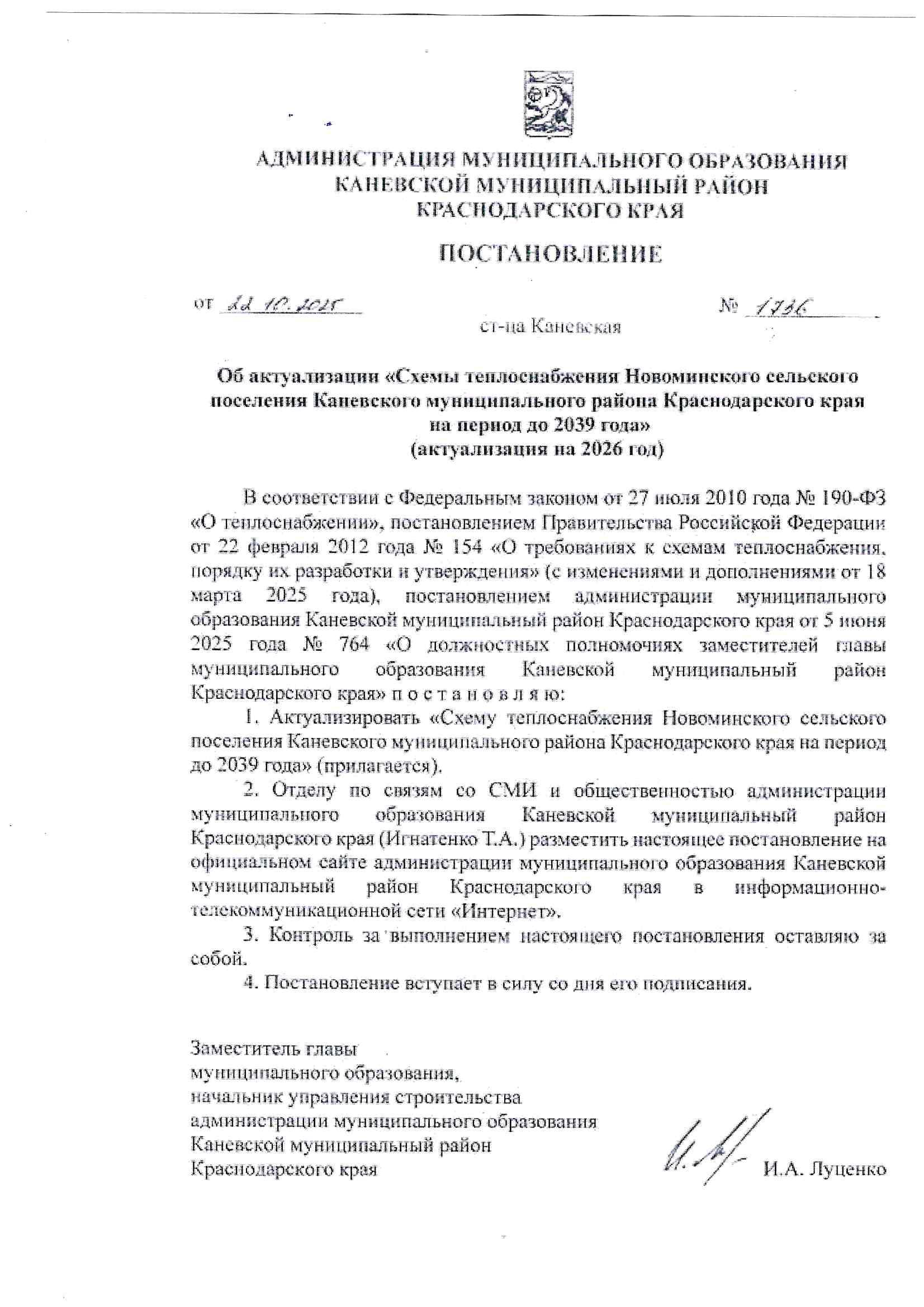 На основании постановления администрации муниципального образования Каневской муниципальный район Краснодарского края от 22 октября 2025 года № 1736 актуализирована схема теплоснабжения Новоминского сельского поселения Каневского муниципального района Краснодарского края на период до 2039 года. Схема теплоснабжения размещена на сайте в разделе «Жилищно-коммунальное хозяйство».